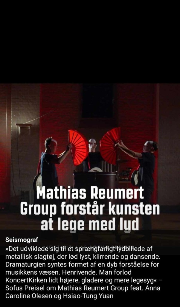 Short criticism about concert MR group feat. Anna Olesen and Hsiao-Tung Yuan 2025 (link)Impro opening at MULF 2024 FI Maiju Pohjanheimo (link)Short criticism < En bilmanual og håndens magi> 2024 Seismograf (link)Criticism < Skal det nu være morsomt? Åh ja!> 2023 Seismograf (link)Gongs & Skins International Percussion Festival 2018 MM (video)Seminar “Performing arts education…”, CUZ 2025 (link)Photographer: Kazue IshiyamaAlbum: Book of Mountains and Seas, Naxos 2025 (link)Photographer: Kazue IshiyamaSolo concert – E(n) motion 2021 DK Poster designed by ShuYi HuangPeriferien solo i Oslo Photographer: James LaytonLocal news – Concerto di Musica Classica from 1000Beats festival 2018 ITMasterclass for Tainan University of Technology 2024 TWInterview with DongNanXiPei Radio 2024 (link)Poster from Double Shot percussion Duo concert 2013 TWMasterclass for Tunghai University 2025 TWResidency at Makotaay Eco Art Village 2025 TWMasterclass for Suzhou POLY WeDo Youth Symphony Orchestra Percussion Ensemble 2024 CN